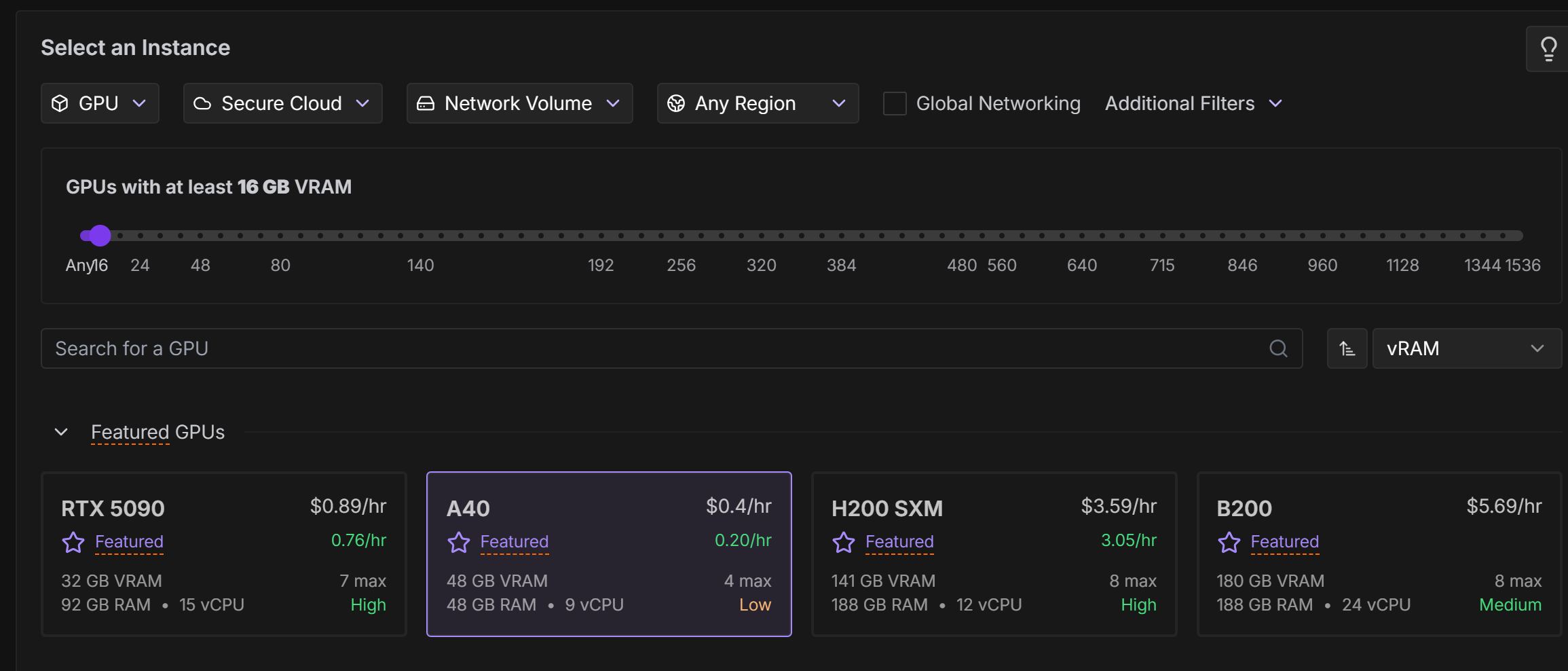 - Secure Cloud: 데이터센터 GPU (안정적, 비쌈)