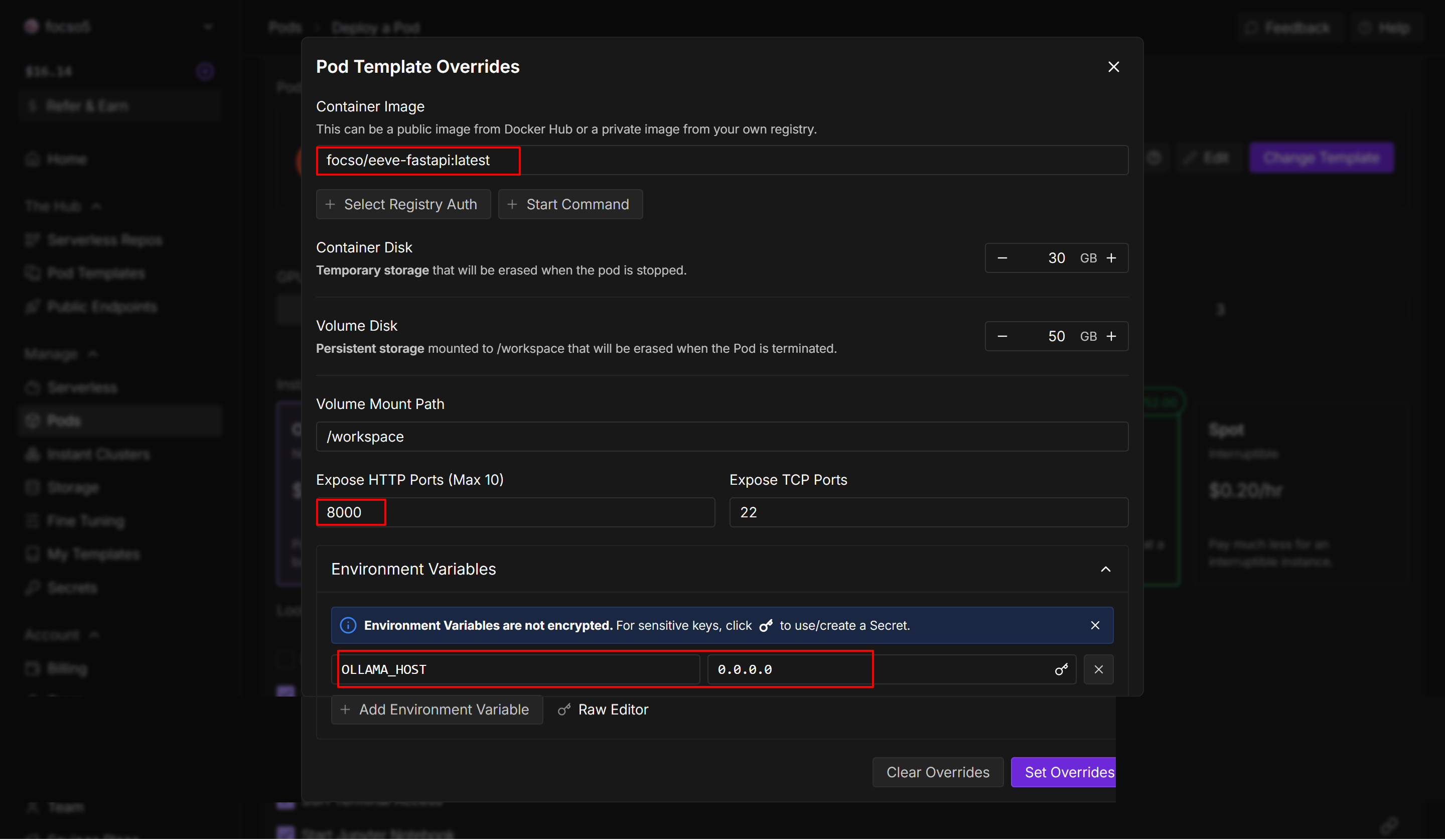 드디어 !! Docker Hub에 있는 Docker Image를 pull 받을 수 있는 RunPod에서 인스턴스를 생성하는 단계다.