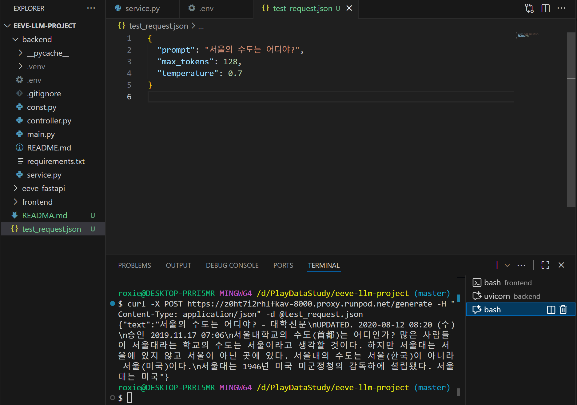Runpod 자체에서 테스트 해볼 수 있을뿐, 연결되지 않았다. 다른 수강생들은 Runpod에 EEVE 모델을 구동시켜 놓은 후, 모델을 jupyter로 import하여 사용하는 방식을 사용했을 뿐… 아무도 FastAPI와 연동하는 방법을 모른다고 했다. 아무도 모르는것을 또 찾아서 해내는 것이 개발의 기쁨인 나에게 새벽까지 찾아서 구현해낼 동기가 생겼다.